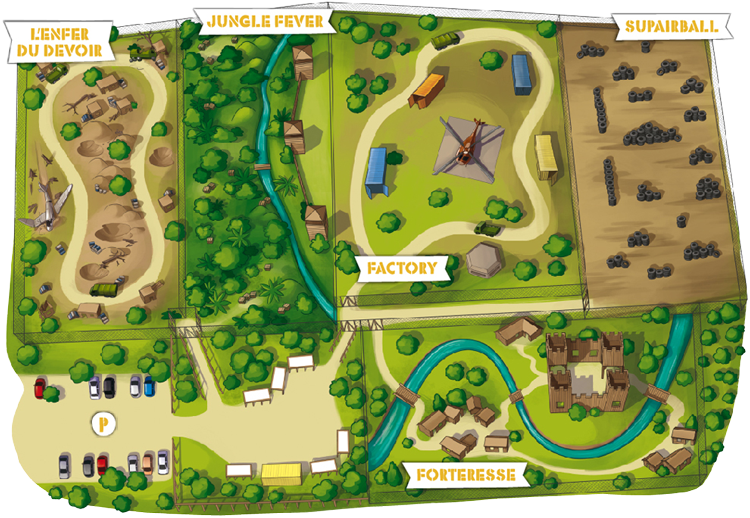 Cinq zones de jeu en plein air sur 40 000 m2, venez découvrir le parcours L'enfer du devoir et ses véritables camions de l'armée,